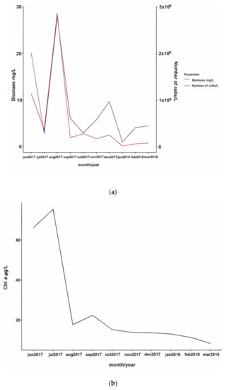 Phytoplankton abundance ranged between 1.9 × 106 cells L−1 in January 2018 to 2.8 × 108 cells L−1 in August 2017. Phytoplankton biomass ranged from 1.05 mg L−1 in January 2018 to 27.85 mg L−1 in August 2017, related to the cyanobacterial bloom of Microcystis spp. (Figure 3a). The chlorophyll a value fluctuated from 8.37 μg L−1 (March 2018) to 75.3 μg L−1 (July 2017). Concurrently, the highest peak of chlorophyll a concentration was not recorded during the cyanobacterial bloom in August 2017, but instead in July 2017, during the proliferation of green algae, predominantly Scenedesmus quadricauda (Turpin) Brébisson (Figure 3b).