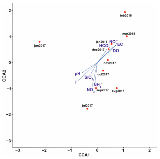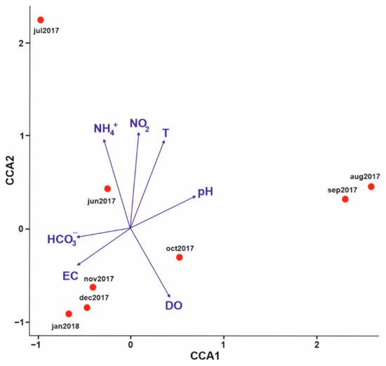 The CCA analysis performed on the bacterial community and seven constrained environmental variables (Figure 7) indicated eigenvalues for the first two axes of 0.7131 and 0.6563, respectively, explaining 47.2% of the total variance on the first two axes. A Pearson environment-bacterial community permutation for the two significant axes indicated a significant correlation between abiotic constrained values and bacterial functional variables. According to the ANOVA permutation test, the ordination of both axes for environmental variables was statistically significant (p < 0.05). Canonical coefficients and intra-set correlations carried out on the bacterial community samples showed that pH and DO were the most important variables for the ordination axis 1 (intra-set correlation coefficients: 0.6140 and 0.3770, respectively). Regarding axis 2, NO2− and NH4+ (intra-set correlations: 0.9229 and 0.8706, respectively) were the variables that weighted most for ordination. At the positive end of both axes, the bacterial community’s samples were associated with T, pH, and NO2−. At the negative end of both axes, the bacterial community’s samples were associated with EC and HCO3−. Based on the position of the samples related to the CCA1 axis, the bacterial community separated into two groups (Figure 7). The first group, comprised of summer samples (June to September 2017), correlated with a high concentration of NH4+ and NO2−, and high values of pH and T. According to the percentage of classified OTUs, the most common phyla in the first group were Cyanobacteria, with the most dominant families being Pseudanabaenaceae (June 2017), Microcystaceae (July 2017), and Synechococcaceae and Microcystaceae (August 2017). This was also confirmed by a morphological approach, except for the picocyanobacterium of the genus Cyanobium, which is hard to detect under light microscopy. In June, Planctomycetota were codominant with Cyanobacteria. The sample from July was singled out as a result of the codominance of Cyanobacteria and Bacteroidota, which correlated with the concentration of NH4+. The second group, comprising samples from the colder months (October 2017 to January 2018), correlated with low T and higher concentrations of HCO3−, DO, and EC. Actinobacteriota was the dominant phylum in October 2017 and January 2018, whilst samples from November and December were dominated by Proteobacteria.
