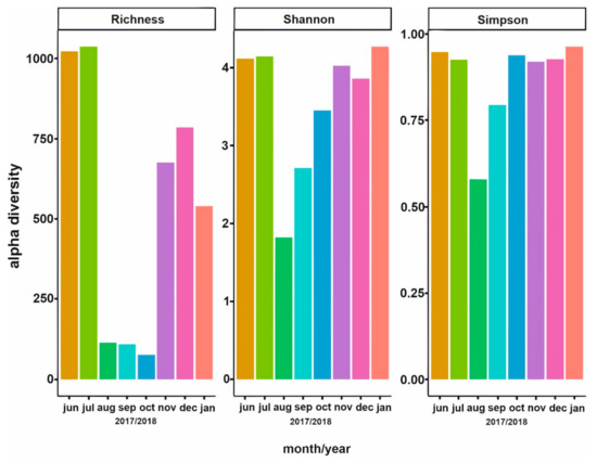 Alpha diversity of the richness, Shannon, and Simpson indices of the bacterial community inferred from the molecular approach during the investigated period.