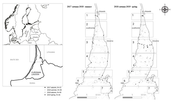 The study area with the sampling sites (indicated by symbols) and profiles (indicated by squares with numbers) in the Curonian Lagoon for the period of 2017–2019. N—number of the study sites.