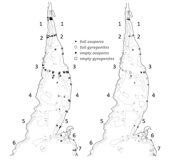 The distribution of charophyte fructifications in the study area: empty oospores and gyrogonites (left), viable (full) oospores, and gyrogonites (right). Numbers along the shores indicate the profiles.