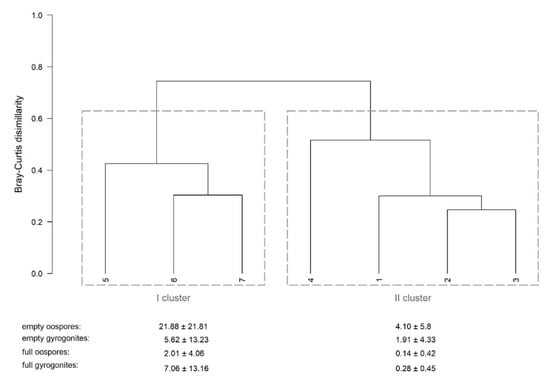 The Bray–Curtis dissimilarity [34] was applied to quantify differences in the densities of the fructifications between the profiles (the averaged density of each type of fructifications at three depths: 1, 2, and 3 m), which was inspected by the hierarchical cluster analysis using the “vegan” package [35] in R. The one factor analysis-of-similarities was used to test differences between groups of clusters.