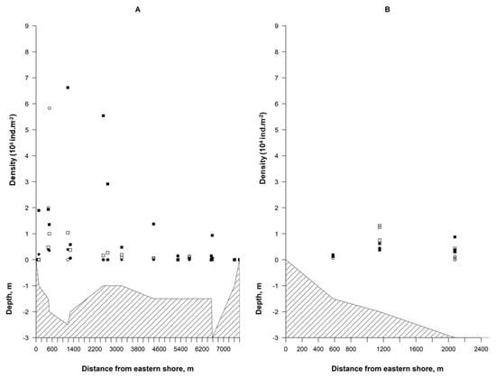 The distribution of the density of charophyte fructifications in the most representative profiles (third and sixth) of the first cluster (A) and the second cluster (B) during the period of 2017–2019. Full circles—full oospores, empty circles—full gyrogonites, full squares—empty oospores, and empty squares—empty gyrogonites.