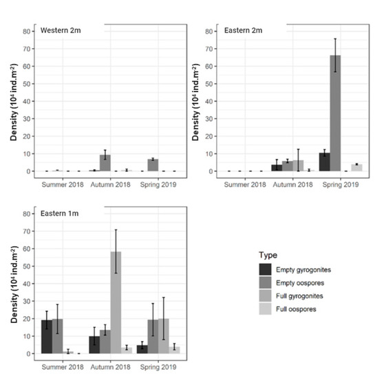 We did not find charophyte fructifications on the western shore at the 1 m depth during all seasons. Empty fructifications prevailed at the 2 m depth, but no significant differences (p > 0.05) were observed in the mean density between the seasons for any type of fructification. At the same depth on the eastern shore, the highest mean density of empty oospores and gyrogonites were estimated in the spring 2019, while no fructifications were recorded in the summer 2018. The mean density of full gyrogonites in the autumn of 2018 was significantly (p < 0.05) higher than in the spring of 2019. The mean density of full oospores in the spring of 2019 was significantly (p < 0.05) higher than in the autumn of 2018.