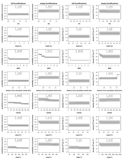 The distance to the charophyte stands was the most important factor (relative importance = 67%) in explaining the occurrence of empty fructifications (Figure 6). The distance from the charophytes stands had negative relationship with the response variable. Empty fructifications were mostly found (probability > 60%) less than 2 km away from the charophyte stands. The bottom aspect and slope were less important (relative importance, respectively, 16% and 8%), indicating the highest probability (>60%) of empty fructifications on flat bottom slopes (<0.15°) exposed to the northern, eastern, or southern directions (aspect of 0–160°). The other factors were of less importance (<6%). The higher probability of empty fructifications was up to 200 REI and salinity > 0.31. The effect of TPI and depth was not important for the occurrence of empty fructifications.