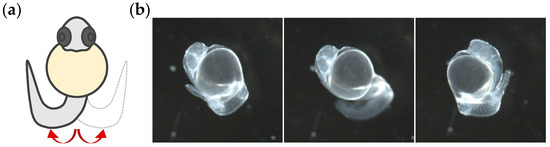 Tail coiling activity in zebrafish (Danio rerio) embryos. (a) Drawing of embryo showing the direction of alternating coils of the tail. (b) Dechorionated embryo at 26 h post-fertilization (hpf) exhibiting consecutive tail coiling. Left: tail coiling to the right side; middle: transient tail coiling; right: tail coiling to the left side. Removal of the chorion was performed for a better visualization, and this procedure was not conducted for embryos used in experiments. Amplification: 1.0×.