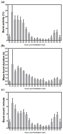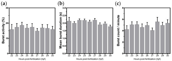 In the above experiments, the period from 22 to 28 hpf of development seemed to be appropriate for monitoring the coiling activity in all tested parameters. When we shortened the period between measurements and monitored the coiling activity from 22 to 30 hpf every 1 h, results demonstrated that there were no significant differences between measurements from burst activity, mean burst duration, or burst counts per minute (Figure 3a–c).