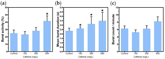 The 26 hpf survival rates were 100% for controls and embryos exposed to caffeine, fluoxetine, or MS-222. Also, embryos did not present any morphological abnormalities in all tested concentrations. The highest concentration of caffeine (600 mg/L) led to a significant increase in the percentage of time the embryo was moving (p > 0.0001) (Figure 4a), whereas exposure to all tested concentrations of caffeine resulted in an increase of mean burst duration in a concentration-dependent manner (p = 0.0008) (Figure 4b). Burst count was not affected by caffeine (Figure 4c).