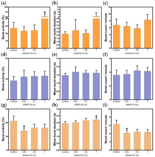 Embryos exposed to all concentrations of organic solvents developed normally until 26 hpf, and no mortality was observed. Exposure to up to 1% acetone resulted in a higher percentage of burst activity when compared to the control (p = 0.0003) (Figure 6a). Althought other parameters seemed to be affected by acetone exposure up to 1%, the differences were not significant (Figure 6b,c). No tested concentrations of DMSO affected any of the coiling activity parameters (Figure 6d–f). Conversely, 0.25% ethanol caused a slight decrease in the percentage of burst activity (p = 0.04) (Figure 6g) and counting of bursts per minute (p = 0.0018) (Figure 6i), while mean burst duration was higher in 1% ethanol exposure, but not in lower concentrations (p = 0.0093) (Figure 6h).