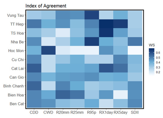 Heatmap of the Willmott scores between observed and simulated extreme indices at each station for the baseline period (1980–2009).