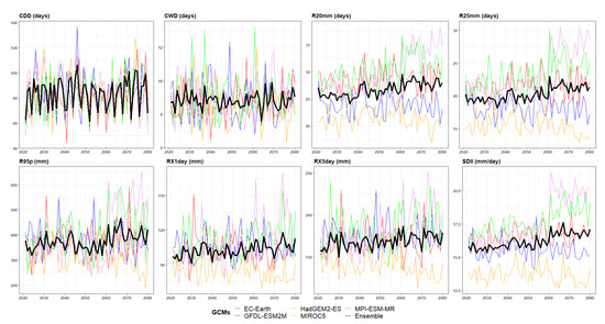 Temporal variation of the spatially averaged extreme precipitation indices for entire study area during the future period (2021–2080). Each color line represents a distinct model while the bold and black line indicates the multi-model ensemble mean.