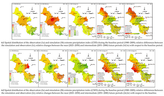 Particularly, regarding the index CDD, the relative changes between the future and historical periods, along with the statistical significance, stability, and magnitude of trends, are shown in Figure 6(6.1). During the near future period (2021–2050), the averaged multi-model ensemble predicts an increase in the index CDD for most regions in the central and southern parts of the study area, whereby a variation of percentage changes in indices is from 0.4 to 20.6%; the averaged growth rate is from 0.4 to 13.1 [days.decade−1]. However, only three stations located in the southern region present significant increasing trends during the near future period, in which the strongest and most stable upward trend in CDD is predicted to occur at the Tam Thon Hiep Station. In contrast, a decrease ranging from −20.1 to −8.7% is predicted in the northern regions, while Cu Chi Station shows a slight increase by 3.7%; even though none of the downward trends is statistically significant. In the intermediate future period (2051–2080), the spatial distribution of the CDD is similar with that of the near future period in the study area, in which the positive percentage changes concentrate in the central and southern parts, while negative values are distributed mostly in the northern regions of the city. During this intermediate future period, the mean percentage of changes in CDD is predicted to decrease from −20.1 to −1.7% at Cu Chi, Hoc Mon, Can Gio, Bien Hoa, and Ben Cat, and to increase from 1.82 to 21.8% at the other stations, whereby the averaged magnitude of increasing trend is ranging between 0.1 and 10.4 [days.decade−1] while the decreasing rate is from −2.9 to −0.8 [days.decade−1].