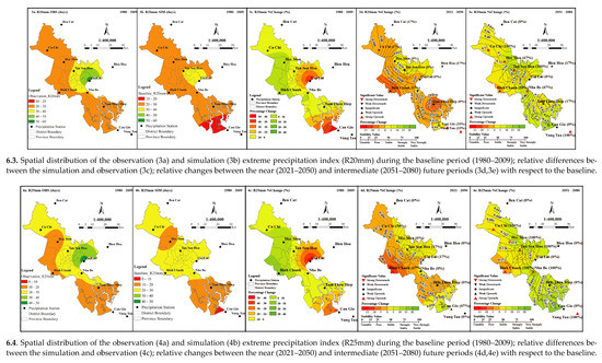 Generally, in comparison with the baseline period, the absolute changes of extreme indices in the intermediate future period (2051–2080) show notably higher than those in the near future period (2021–2050). In which, the largest absolute changes mainly occur in the southern regions, while some parts of the northern and central areas often exhibit little changes (i.e., lowest absolute changes). In terms of relative changes in extreme rainfall indices in the same projection period, the multi-model ensemble predicts an increase in most indicators in the south and the central regions, and a decline of those indices in the north of the study area.