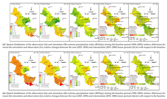 The relative changes in the maximum 1-day and 5-day total rainfall amount (RX1day and RX5day) between the future and the historical periods are shown in Figure 6(6.5d,e–6.6d,e). The simulation results show that the spatial distribution of the indices RX1day and RX5day in each future period is relatively similar.