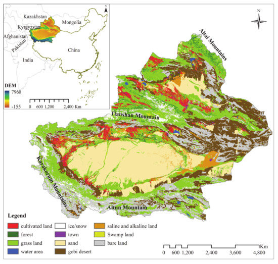 Xinjiang region geographical location, topography, and land use: geographical location data from standard map website (Review picture serial number: GS(2019)3266), The DEM data are from USGS, and the land use types are abbreviated from the vegetation type map of China at a scale of 1:1,000,000.