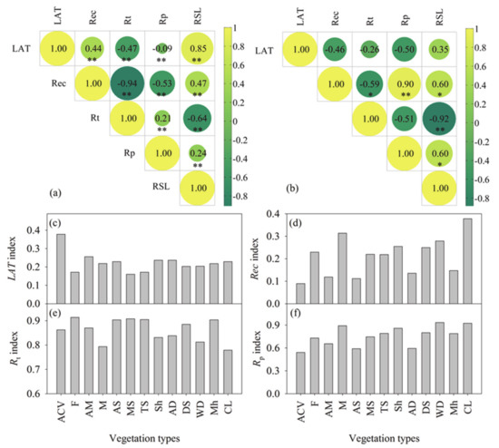 The correlation between the index of different aspects of ecosystem resilience and their values on different vegetation types: (a,b) are the correlation of each index on the scale of pixel and vegetation type, respectively. The symbol ‘**’ and ‘*’ in (a,b) indicates the extremely significant correlation and significant correlation, respectively. Panel (c–f) shows the latitude of resilience (LAT), recovery rate (Rec), and the resistance of ecosystem to temperature (Rt) and precipitation (Rp) on vegetation type scale. ACV stands for alpine cushion vegetation, F stands for forest, Sh stands for shrub, M stands for meadow, AM stands for alpine meadow, AS stands for alpine steppe, MS stands for meadow steppe, TS stands for typical steppe, DS stands for desert steppe, AD stands for alpine desert, WD stands for warm desert, Mh stands for marshland, and CL stands for cultivated land.
