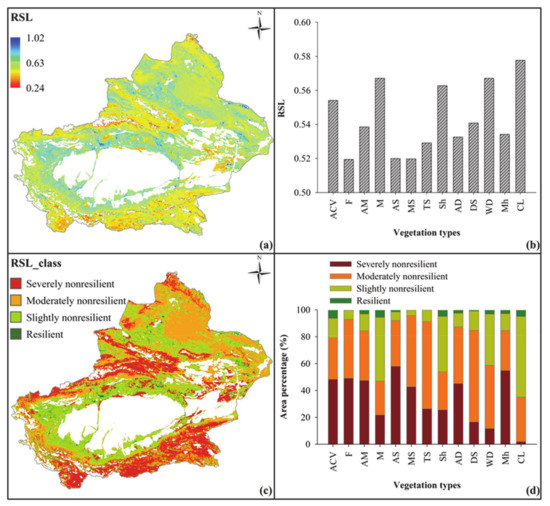 The comprehensive ecosystem resilience (RSL) index in the study region. (a) RSL on the pixel scale, (b) average RSL of different vegetation types, (c) the grading results of RSL, and (d) area percentage of different RSL classifications for different vegetation types. In (b,d), ACV stands for alpine cushion vegetation, F stands for forest, Sh stands for shrub, M stands for meadow, AM stands for alpine meadow, AS stands for alpine steppe, MS stands for meadow steppe, TS stands for typical steppe, DS stands for desert steppe, AD stands for alpine desert, WD stands for warm desert, Mh stands for marshland, and CL stands for cultivated land.