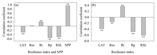 Generally, vegetation with profitable growth and high coverage often means that the ecosystem may have high diversity and ecosystem stability, but this does not mean high ecosystem resilience. At least in arid areas, this view needs to be updated. This study showed that the resilience index, except the Rec, all presented a significant correlation with vegetation coverage. Among them, the LAT, Rp, and RSL index were negatively correlated with vegetation coverage, and the correlation coefficients was −0.29, −0.54, and −0.50, respectively, while the Rt index was positively correlated with coverage, and the correlation coefficient was 0.20 (Figure 4a). Although the higher vegetation coverage can bring higher biomass (correlation coefficient was 0.96), the higher biomass was not equivalent to the high ecosystem resilience (Figure 4a,b). Similarly, the LAT, Rp, and RSL index were also significantly negatively correlated with NPP, and the correlation coefficients were −0.38, −0.49, and −0.61, respectively.