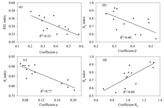 The comparison results showed that the RSL index was negatively correlated with coefficient α, while the Rt and Rw indexes were also negatively correlated with coefficients ϕ and β, respectively (Figure 5). Additionally, coefficient Rd was negatively correlated with coefficient β, while it was positively correlated with Rw. The above comparative analysis showed that although there are differences in the index values calculated by the method proposed in this study and existing methods, all indices had consistent trends. The results suggest that this method-index can replace current methods in most cases, and it is also a useful supplement and improvement of the existing ecosystem resilience assessments.