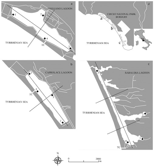 The study was carried out in three lagoons located on the western coast of central Italy within the Circeo National Park (CNP): Fogliano, Caprolace, and Sabaudia. They are non-tidal (<50 cm), euhaline lagoons (average 30 psu) within the Mediterranean ecoregion following the classification of transitional waters under the WFD [8].