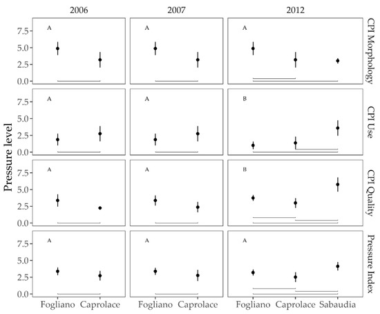 A detailed quantification of the anthropogenic pressures was carried out for each water body based on the approach by Aubry and Elliott [36]. The sectors identified for designing field campaigns were considered also for the quantification of the anthropogenic pressures (see Section 2.2.1. Fish data). A specific set of indicators of pressures/impacts relevant to the water bodies typology considered in this study were ranked on a scale between 0 (no pressure) and 9 (very high pressure) (Table 3 and Table S1).