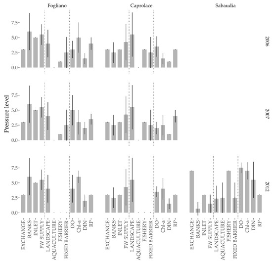 Comparing all three lagoons, which was possible for the year 2012 (Figure 2), Sabaudia showed morphological pressure similar to the one for Caprolace (post hoc Bonferroni–Holm test: p = 0.597), and lower than the one observed for Fogliano (FOG-SAB, p < 0.001). Pressure/impact levels for Use were higher in Sabaudia than in the other lagoons (CAP-SAB, p < 0.001; FOG-SAB, p < 0.001), and the same applied to Quality (FOG-SAB, p < 0.001; CAP-SAB, p < 0.001). Hence, Sabaudia was the lagoon showing the higher overall pressure level (p < 0.001).