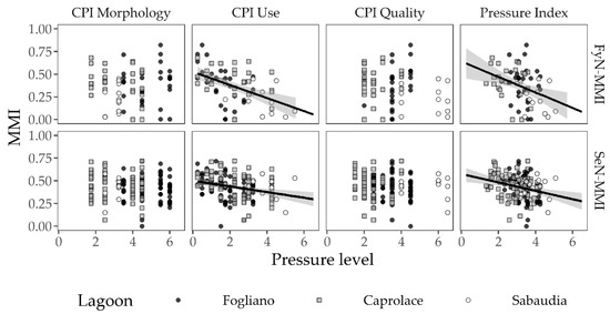 Figure 4 shows the distribution of both the MMI values against the pressure levels. SeN-MMI and FyN-MMI showed a slightly different but very weak relationship with CPI Morphology (Table 6), strongly affected by the high variability of the response, in particular in some of the lagoons (e.g., Fogliano, spreading from 0 to 0.77 at the same level of CPI Morphology).