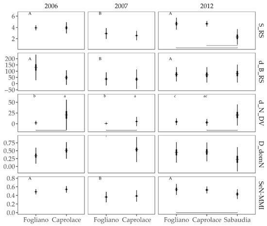 Comparison among lagoons (x axis) and years (columns of plots) for the SeN-MMI and the included metrics (S_RS = number of resident species; D_domN = Margalef index evaluated on the dominant species; d_N_DV = abundance density of detritivours; d_B_RS = biomass density of resident species), represented as average (horizontal thin line), standard error (thick vertical error line), and standard deviation (thin vertical error bar). Significant (p < 0.05) differences among years (considered only for Fogliano and Caprolace) are reported with the capital letters in the upper left of each plot. Significant (p < 0.05) pairwise differences among lagoons (for 2012, Sabaudia is also included) emerging from the post hoc comparisons are highlighted with gray lines at the bottom of each plot. In case of significant interaction (p < 0.05) among time and lagoons, the groups highlighted from the post hoc comparison are reported using lower case symbols above reported in the plots. For the units of the metrics see Table S2.