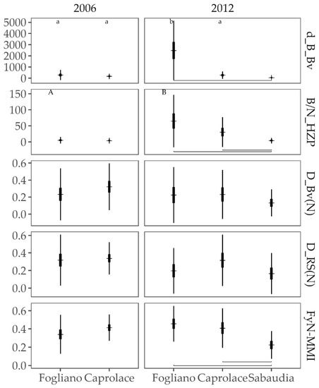 Comparison among lagoons (x axis) and years (columns of plots) for the FyN-MMI and the included metrics (D_RS(N)= Margalef index evaluated on the abundance of estuarine resident species; d_B_Bv= biomass density of benthivorous species; B/N_HZP = mean individual weight of hyperbenthivorous/zooplanktivorous/piscivorous species; D_Bv(N)), Margalef index evaluated on the abundance of benthivorous species) represented as average (horizontal thin line), standard error (thick vertical error line), and standard deviation (thin vertical error bar). Significant (p < 0.05) differences among years (considered only for Fogliano and Caprolace) are reported with the capital letters in the upper left of each plot. Significant (p < 0.05) pairwise differences among lagoons (for 2012, Sabaudia is also included) emerging from the post hoc comparisons are highlighted with gray lines at the bottom of each plot. In case of significant interaction (p < 0.05) among time and lagoons, the groups highlighted from the post hoc comparison are reported using lower case symbols above reported in the plots. For the units of the metrics see Table S2.