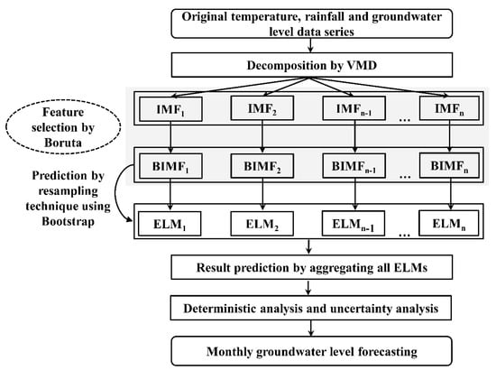 For model construction, firstly, the VMD technique was adopted to decompose the original precipitation, temperature and groundwater series (for both training and testing sets) into the same number of IMFs with corresponding low–high frequency components to obtain stationary subseries. Secondly, the Boruta feature selection algorithm was used to select appropriate input components for each IMF during the training phase in order to build concise and efficient models. Thirdly, the ELM model was applied to simulate all IMFs. Finally, the predicted IMFs were obtained by aggregating the results of all obtained IMF components. This process was carried out for deterministic analysis. In terms of uncertainty analysis, each selected IMF by Boruta was randomly resampled 1000 times (see Section 2.4; running the ELM model obtains 1000 outputs for each IMF series. The prediction results of all IMFs are aggregated 1000 times to obtain the final 1000 outputs used as uncertainty analysis. The schematics of the process are illustrated in Figure 1.