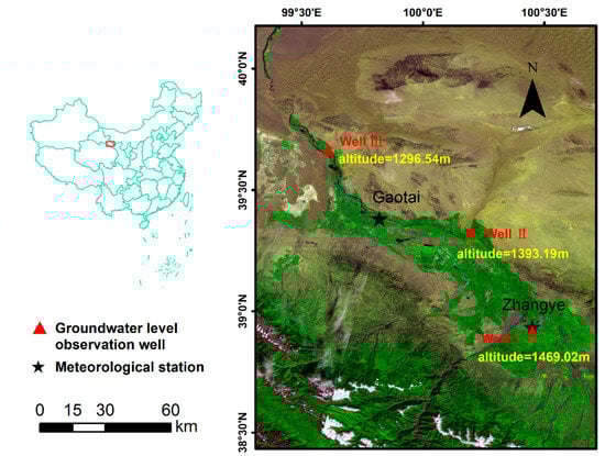 The Zhangye basin, which can be regarded as the main commodity grain production base with the typical irrigated agriculture and dense population of arid regions in China, occupies a very important position along the Silk Road Economic Belt. Groundwater is the major source of water supply for crop irrigation, production and domestic use. However, the rapid population growth, oasis expansion and urbanization have recently increased the amount of groundwater use resulting in an over–extraction problem in this area []. The 2016 government report shows that the total area of groundwater overexploitation was 2418.30 km2 and the amount of over-exploitation reached 192.64 million m3 in this area. The over-extraction of groundwater further decreases groundwater levels, threatening the sustainable development of the regional ecosystem. Therefore, accurate determination of groundwater level is important for the rational planning of water resources. In this study, three typical groundwater observation wells, namely well I, well II and well III, were selected according to altitude gradients, ranked from high to low as well I > well II > well III.