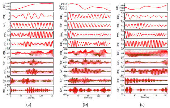 Decomposed results of training periods by variational mode decomposition (VMD) for monthly groundwater level at Well I (a), Well II (b) and Well III (c).