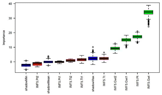 In terms of the Boruta result plot, the blue boxplots represent the minimal, average and maximum Z scores of the shadow attribute. The red and green boxplots correspond to the Z scores of the rejected and confirmed attributes, respectively. It can be seen from this figure that five attributes were identified as unimportant variables (the fifth mode of Pt2, Pt1, Tt2, Tt1 and Tt), and four attributes were tagged as important variables including IMF5 (Pt), IMF5 (GWt2), IMF5 (GWt1), IMF5 (GWt).