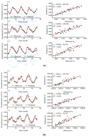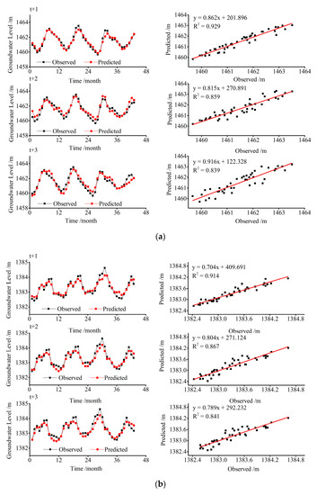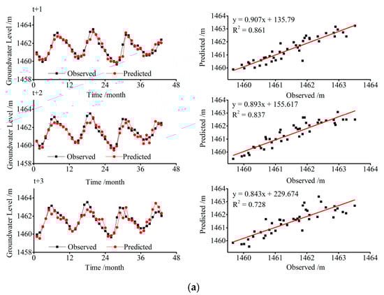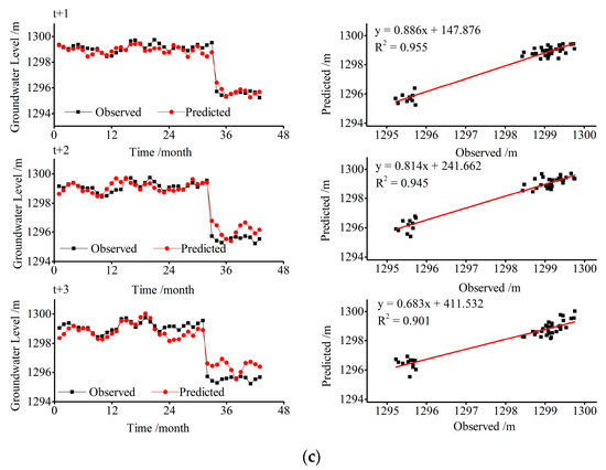 The hydrographs and scatter plots of groundwater level estimated by the VBELM model during the testing period for the three wells at 1, 2 and 3 months ahead forecasting are displayed in Figure 5. The left hydrographs clearly illustrate that the prediction results of the three wells were in line with the expectation values. That is to say, the evaluated groundwater levels were closer to the observations and followed the same trend. Meanwhile, the longer the lead times, the worse the simulation performances for groundwater level forecasting with the results of the 1-month ahead fitting the best, while those of the 3-months ahead fitted the worst. Besides, the superior simulation results of well I can also be distinctly discovered when comparing with that of well II and well III as the predicted values effectively fitted the fluctuations of the real values at both peaks and valleys for well I. Besides, it can also be observed that the scatter plots for well I are less dispersive and closer to the fitted lines than for well II and well III, which again proves the above result. Moreover, the same gradually decreasing tendency can also be discovered from the R2 values with the prediction time getting longer. This finding further certificates the deteriorating fitting performance of the hybrid model with an increase in the forecast time. This is in accordance with many other studies in groundwater level estimation [,,].