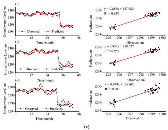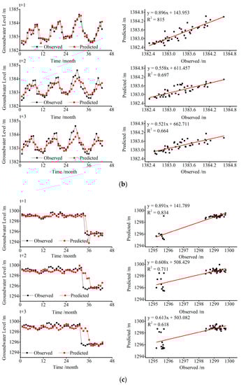 Observed groundwater level and forecasted by VBELM model for 1, 2 and 3-month ahead during the testing period at Well I (a), Well II (b) and Well III (c).
