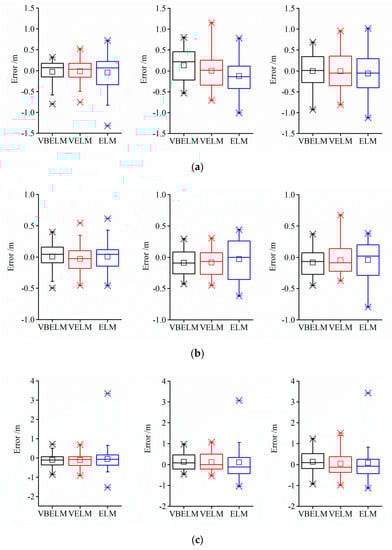 Figure 6 and Figure 7 show the hydrographs and scatter plots of the VELM and ELM models for the three wells. It can be observed that the predicted values fitted the trend of the real values for both the two methods satisfactorily. Combining with Figure 4, it can be found that the predicted values obtained by the VBELM model better traced the fluctuation of the real values relative to the VELM and ELM models. Besides, it is worthwhile to note that the VBELM model achieved the best performance at both peaks and valleys among the three models, while the poorest performance can be found in the ELM model. Likewise, the best fitting outcomes from the short to long scenarios were still derived by the VBELM regarding the fact that the fitting performance of the three models descended with the increase in lead time. The results reasserted the superior performance of the proposed VBELM method for monthly groundwater level forecasting.