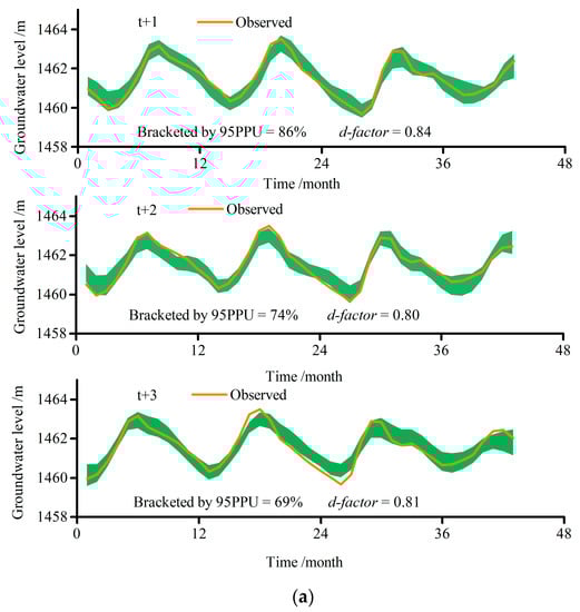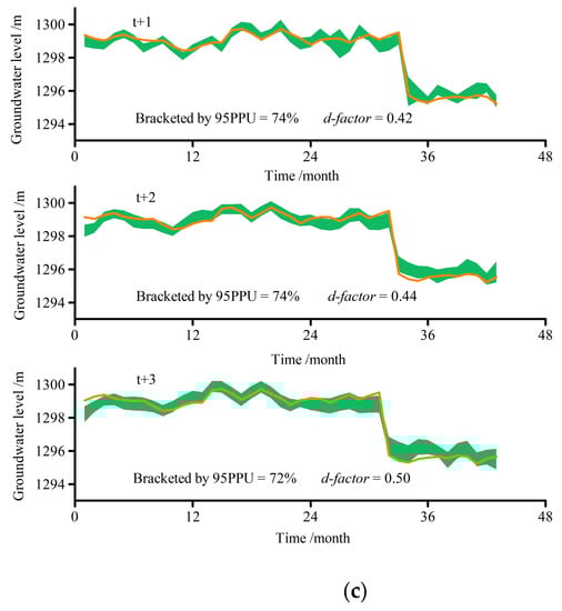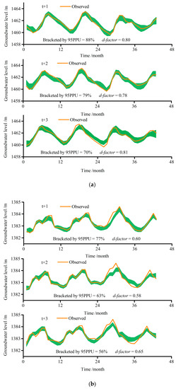 Especially, the uncertainty residing in the stochastic AI algorithms remains a problem that cannot be ignored when conducting these models. Therefore, uncertainty analysis is an indispensable procedure to get reliable simulation results since these models are susceptible to input data, and incapable of reproducing the same results even in identical situations. However, the uncertainty of hybrid models in the estimation process is often neglected in most cases, regarding the fact that the deterministic analysis of hybrid models is the main focus. The bootstrap method coupled with a resampling technique can be an effective method for uncertainty analysis due to the advantages of the more convenient computation process relative to derivatives and the Hessian-matrix involved in the delta method, or the Monte Carlo simulations involved in the Bayesian approach, and has been successfully used in a wide range of problems in hydrological modeling [,,,]. The applications of combining a machine learning method based on data decomposition technology and a bootstrap resamples method are described in detail in [,,]. These researchers developed a hybrid wavelet-bootstrap-neural network (WBNN) model for forecasting hourly flood, daily discharge, and medium term urban water demand, respectively, and confirmed the superiority of the bootstrap method in assessing uncertainty. However, the uncertainty of the AI coupled decomposition ensemble models is usually ignored especially in groundwater level prediction. Therefore, the uncertainty analysis based on the bootstrap method was conducted to assess the precision of the hybrid models.