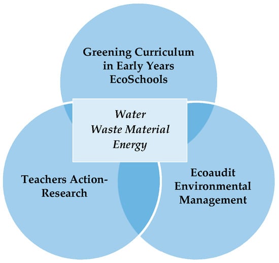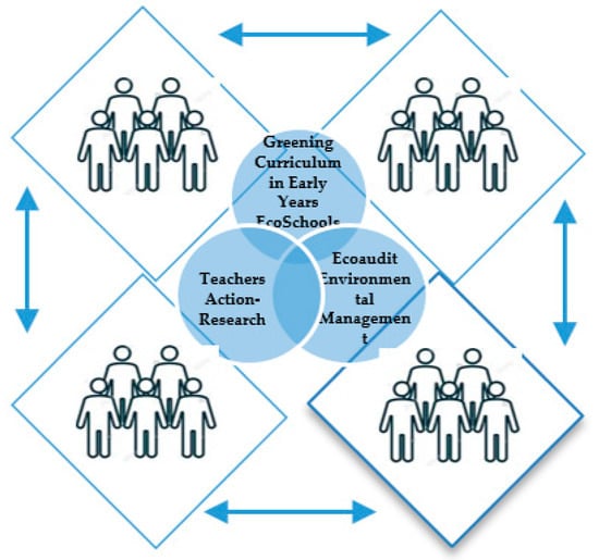 The collaborative action-research experience developed with early childhood education teachers enables the construction of an educational management model that prioritises sustainability as a key element in the life of schools and acts as a stimulus for the teachers’ professional growth and continuous training in specific educational activities, such as the solid waste management of the centre, the control of water consumption, energy expenditure and the use of alternative energies, mobility and travel activities through safe school roads coordinated with families, and other activities to mitigate climate change or the responsible production and consumption of products of proximity in school canteens and kitchens. The educational centre becomes an eco-school: an organisation conceived as an ecosystem that can be characterised as a mini-city made up of biotic and abiotic components, as sets of structures where interactions take place and decisions are made guided by principles of sustainability and environmental respect [1,2,3].