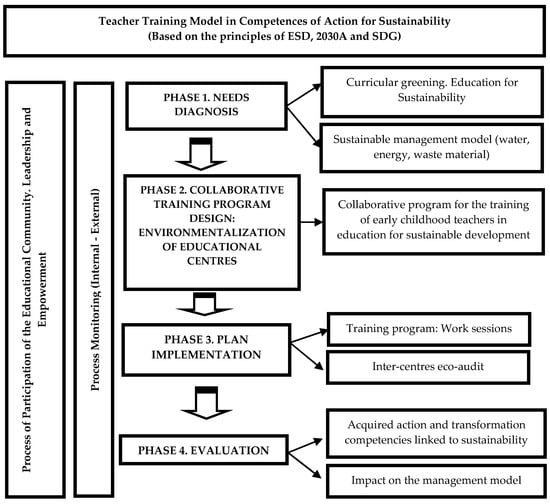 This paper highlights the strengths of a model of curricular innovation and teacher training aimed at the training of teachers in various early childhood educational centres. Two teams of teachers (university academics and early childhood education teachers) work throughout an entire academic year from a collaborative action-research methodological framework. Throughout this study, we describe the phases of the model focussed on professional teacher training and its validation process. The acquisition of action competencies in the sustainable management and leadership of the centre, curricular greening, and action-research is evaluated. Early childhood education teachers from across a network of institutions audit the environmental dimensions of their centres, adopt sustainable measures, and consolidate an understanding of their strengths and weaknesses. The work is enriched by the participation of teachers from different centres in this training experience, particularly those interested in incorporating Education for Sustainability (EfS) as an activity of curricular innovation and for the environmental management of their schools.