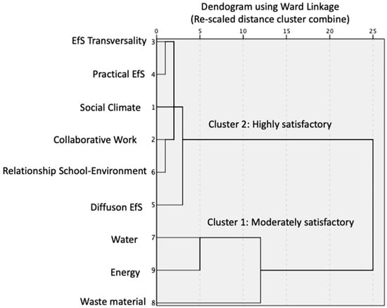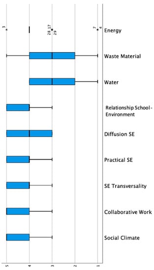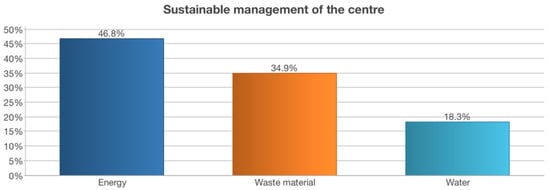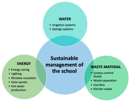 - Sustainable management of the eco-school. This refers to those behavioural guidelines that educational centres have in relation to the treatment of the resources available to them, aiming to encourage these behaviours to be committed to sustainable development in aspects such as water, solid waste, energy, mobility, green areas, as well as the responsible consumption and use of resources. Some authors defend the idea that coherent and ethical sustainable management strategies make the educational centre an organisation endowed with social responsibility [54].