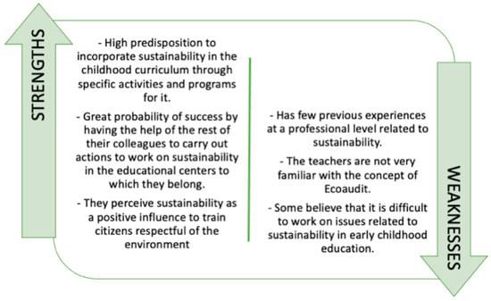 Early childhood education teacher training will facilitate their professional development and empower them to reflect on their own actions and the consequences of their teaching work to generate a sustainability competent citizenry [65]. In this sense, it is necessary to train teachers in certain key competencies that facilitate the professional development of early childhood teachers from the prism of an innovative methodology that combines knowledge and practice; that focusses on criteria related to ethics, social justice, solidarity, and respect for the environment in the generation of such knowledge; that incorporates educational models focussed on project-based learning, and rethinks school management models, moving toward those based on the principles of sustainability [97].