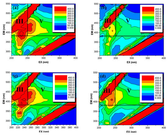 Excitation emission fluorescence matrix (EEM) contour plots of raw water before and after coagulation treatment: (a) natural raw water prior FeCl3 treatment, (b) after FeCl3 treatment, (c) natural raw water prior PACl treatment, (d) after PACl treatment.