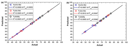 EEM predicted vs. actual plots of the experiment with coagulant (a) FeCl3 and (b) PACl for each response: (◁) humic acid-like species, (⎔) fulvic acid-like species, and (◇) turbidity.