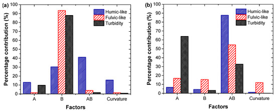 Percent contribution of each equation model term on the overall NOM removal by coagulation using (a) FeCl3 or (b) PACl. Factors: A refers to initial pH, B corresponds to coagulant dose, AB is the term that represents the synergistic interaction between both variables, and curvature of the model.