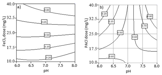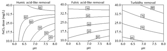 Figure 4 and Figure 5 show the contour plots of the main factors, initial water pH and coagulant dosage, and interaction effects on the NOM removal percentage after using FeCl3 and PACl coagulants, respectively. As shown in Figure 3a, high percentage contributions of coagulant dosage were obtained for FLS and turbidity removals (93.36% and 87.90%, respectively) when FeCl3 was used as the coagulant. This trend is attributed to the initial pH being set at near neutral levels, where charge neutralization occurs. This implies that, for all pH values considered, all runs were expected to yield high removal efficiencies. It was observed in Figure 4 that the removal efficiency improved as the coagulant dosage was increased. This is attributed to the increase in the amount of FeCl3 that hydrolyzed to positive ferric species and subsequently interacted with the negatively charged NOM fractions to form larger complexes [2]. NOM fraction removal efficiency was reported to be constant at a coagulant dosage greater than 40 mg L−1 [25]. At a high coagulant dosage, FeCl3 could not effectively remove NOM because only a portion of Fe could interact with NOM to form Fe–NOM complexes. Meanwhile, the excess of iron dosed will form negatively charged Fe(OH)3 flocs and Fe(OH)4− instead of desired Fe-NOM complex [40].