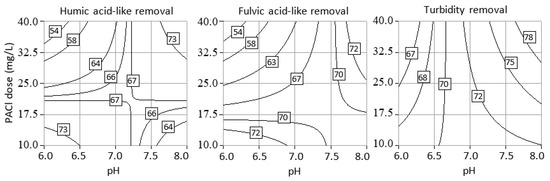 On the other hand, when using PACl, the NOM removal was mainly due to the interaction of initial pH and coagulant dosage (AB) as deduced from Figure 2b. Note that Figure 5 also shows high interaction effects on the parameters considered when PACl coagulant was used. It is evident in the contour plots that pH affected the removal efficiencies. The highest removal percentages were recorded at 40 mg L−1 coagulant dosage and an initial pH of 8, with values of 76% and 81% for fulvic acids and turbidity, respectively. It can be noted that the removal of fulvic at pH 6 and 8 are almost the same, which may be due to the solubility of fulvic acids in both alkali and acidic regions, while humic acids are only soluble in the alkali region [41]. High PACl dosage is not effective in removing turbidity and NOM fractions because only a portion of Al reacts with NOM fraction to form an Al–NOM fraction complex. This is due to the formation of polymer bridges between particles that caused the destabilization of Al-NOM complex, resulting in the repulsion between particles at excessive dosage [42].