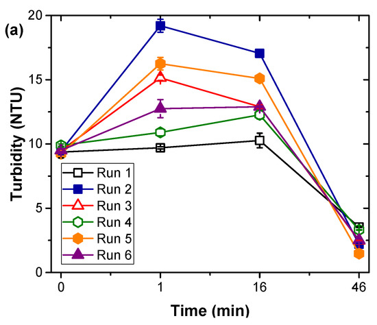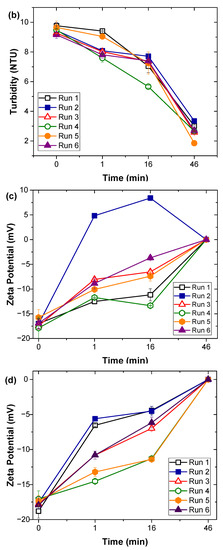 Analysis of turbidity evolution shows interesting trends in the function of coagulant species employed and operational conditions of coagulation treatment, as can be seen in Figure 6. The turbidity spiked up upon addition of FeCl3 coagulant and 1 min rapid mixing, gradually reduced during the flocculation process of 30 min slow mixing, and dropped to near zero at the end of the 30 min sedimentation. Increase in turbidity can be explained by the formation of iron hydroxide flocs after coagulant addition, which removes suspended solids during its settlement [43,44]. Analysis of zeta potential changes during treatment shows a gradual change from initial negative values of −17.09 ± 1.03 to zero. These results that show a gradual increase in zeta potential towards zero can be attributed to charge neutralization.