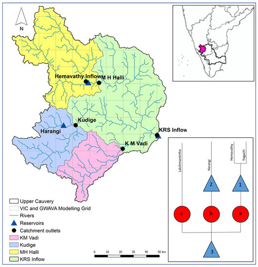 The Cauvery catchment is a heterogeneous, transboundary and highly human-influenced catchment, in Peninsular India. It is spread across four federal states, namely, Karnataka, Tamil Nadu, Kerala and Puducherry in Southern India [18]. The four states have varying water policy, water use prioritisation and cultural value associated with the natural environment. The catchment is a representative of other large catchments in Peninsular India, with water resources under increasing pressure from urbanisation, population growth and agriculture intensification. Additionally, the Cauvery is a contentious river with concern over the sharing of water between Karnataka and Tamil Nadu. The catchment is considered to be highly water-stressed [47] and the current water abstraction is estimated to exceed the renewable water resources within the catchment [48]. The catchment has extensive regional variability in water demand. The agricultural activities within the catchment require approximately 90% of water resources [49,50]. Rapid urban and industrial development across the catchment are causing increased inter-sectorial and interstate competition for water [51]. Across the catchment, there is an abundance of small-scale storage interventions, medium and large reservoirs, and large-scale transfer schemes. It is essential to have a good understanding of the catchment hydrology and develop reliable and robust models to ensure improved water resource management in such highly water-stressed catchments.