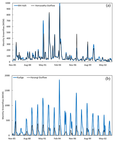 The monthly observed streamflow from (a) M H Halli gauging station and Hemavathy reservoir outflow and (b) Kudige gauging station and Harangi reservoir outflow.