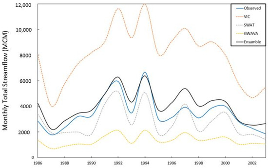 Ensemble modelling is a process where multiple models are utilised to simulate an outcome by using many different modelling algorithms. The mean ensemble model averages the prediction of each model and produces one final simulation of the outcome. Ensemble modelling can be utilised in hydrology to better simulate components of the hydrological cycle, the impacts of land use or other environmental changes, provide a range of possible outcomes and uncertainty [27,28,29]. In larger catchments with relatively poor input data availability, the use of a single model can lead to simulation uncertainties. Ensemble modelling combines multiple model predictions to create a single prediction that tends to strongly outperform the individual models [14,15]. Ensemble modelling can be widely applied to utilise the ensemble for reducing errors with an optimal bias [16].